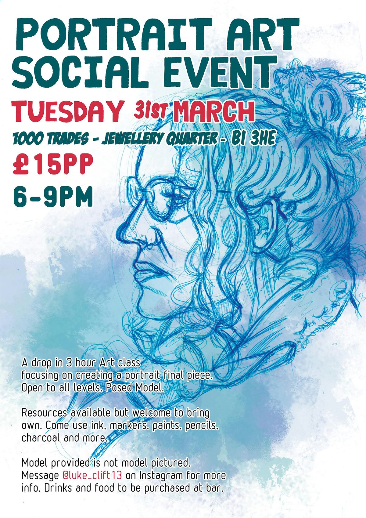 Welcome to the Birmingham Portrait Class at 1000 Trades in Jewellery Quarter Birmingham! Join us on TUESDAY MARCH 31st, 2026 at 6:00 PM for a fun and interactive session where you can learn how to capture the essence of a person through art. No experience is necessary - just bring your creativity and enthusiasm! Event ends at 9pm.