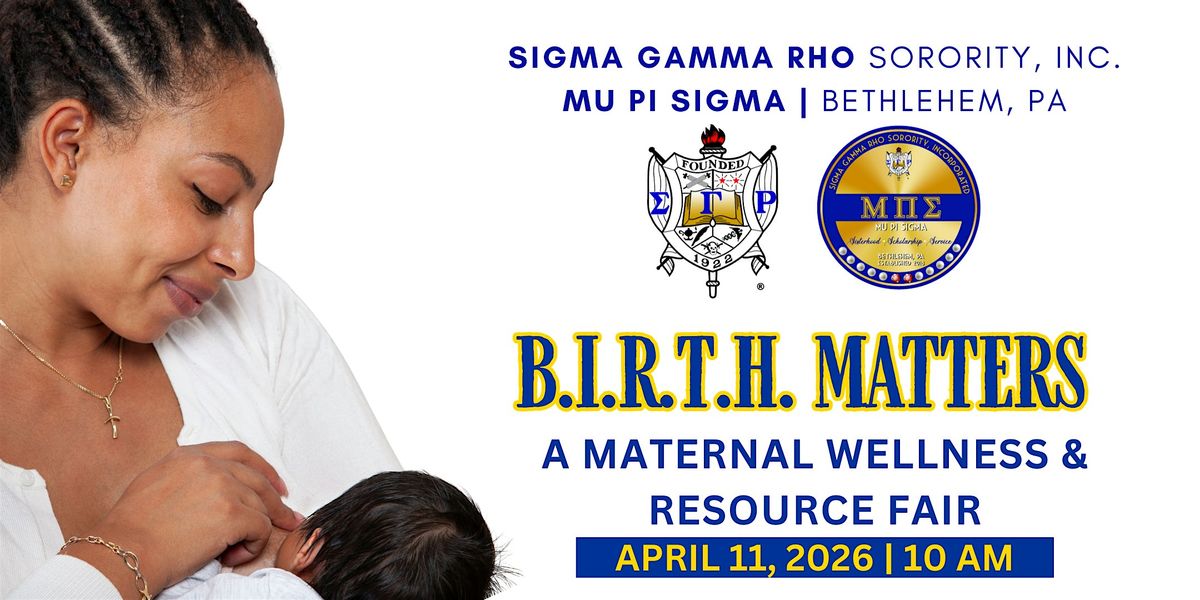 Join the Mu Pi Sigma Alumnae Chapter of Sigma Gamma Rho Sorority, Inc. for B.I.R.T.H. Matters: A Maternal Wellness & Resource Fair, a welcoming and empowering event designed to address maternal and infant health disparities while supporting families at every stage of the journey.