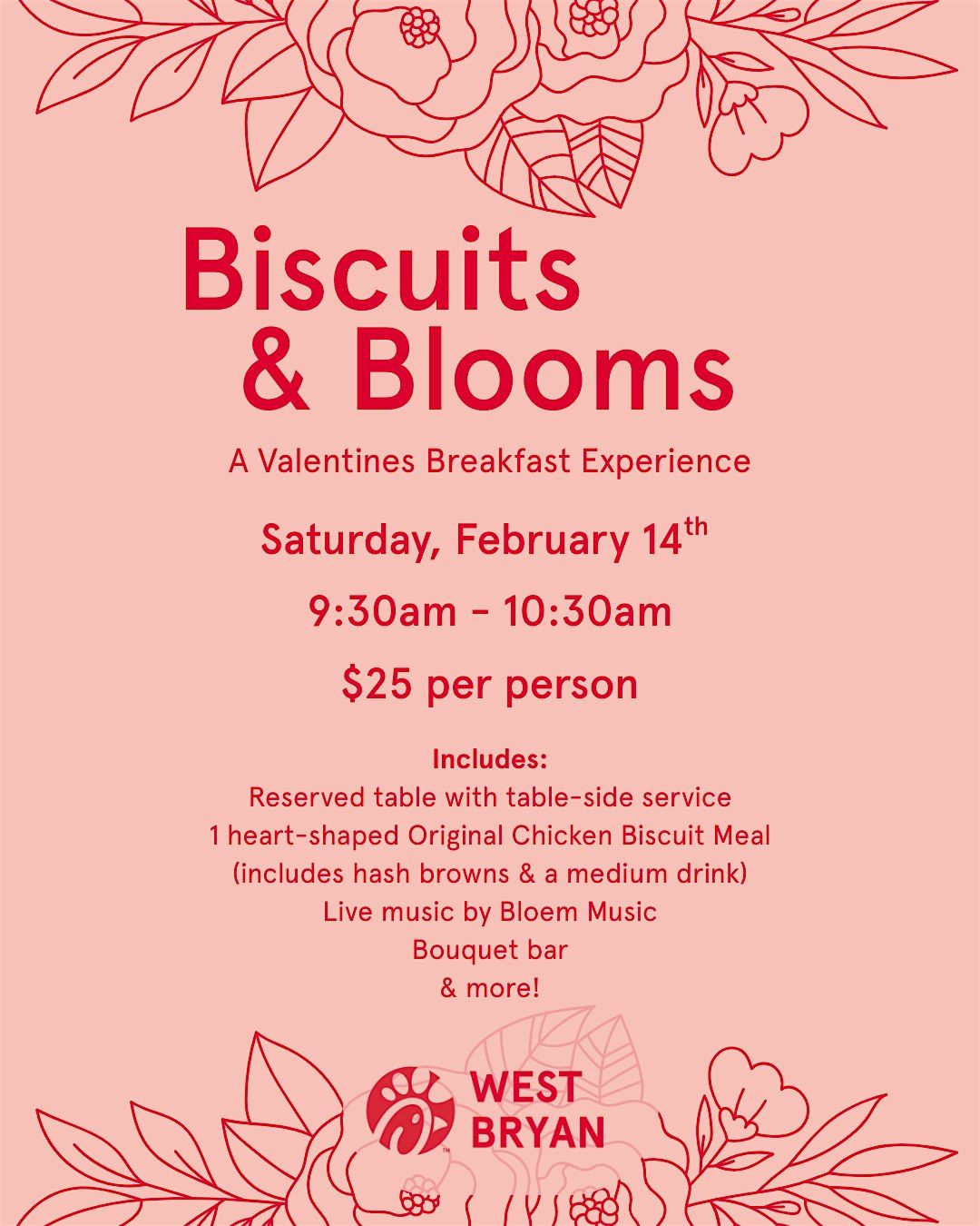 Guests will enjoy a reserved table with table-side service, a heart-shaped Original Chicken Biscuit meal (complete with hash browns and a medium drink), live music from Bloem Music, and access to a beautiful bouquet bar to create your own floral arrangement.