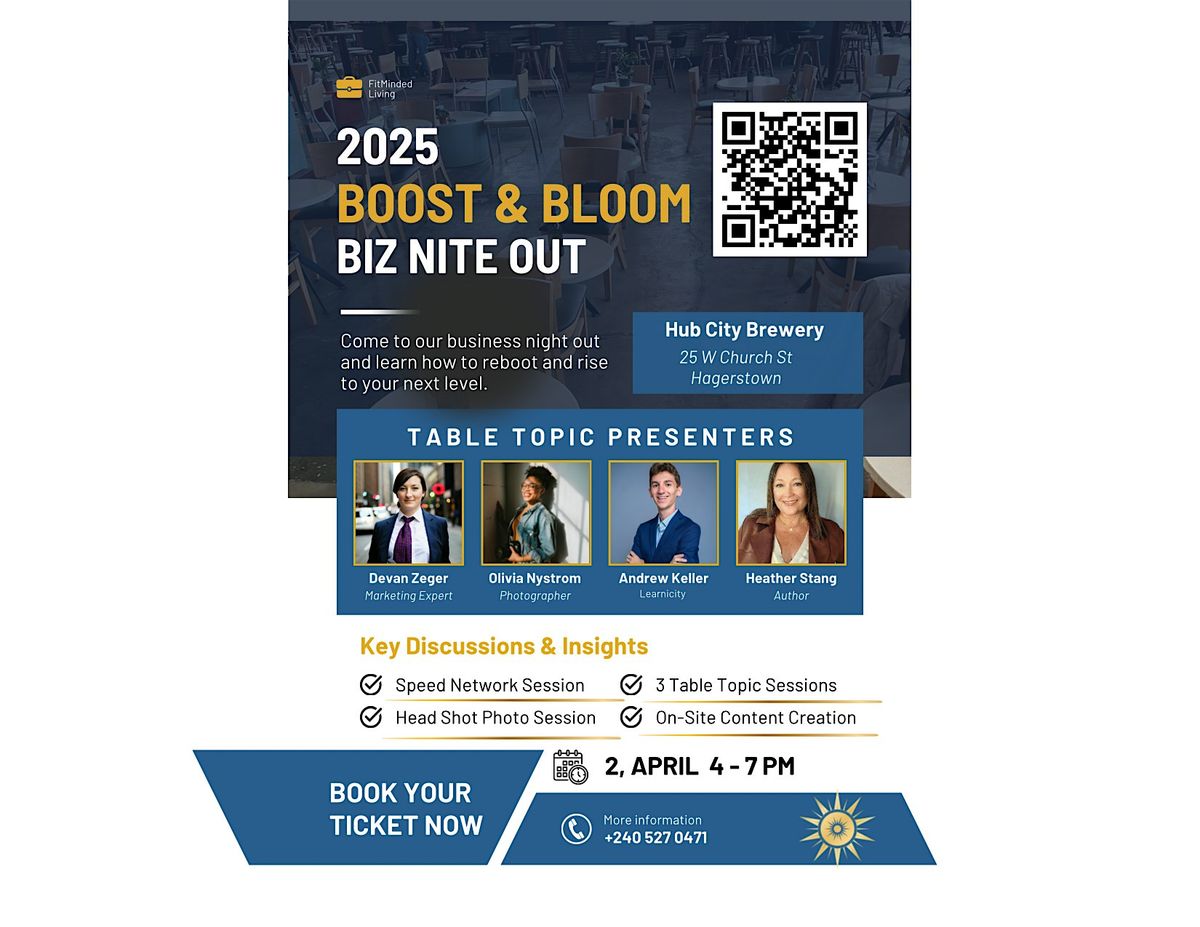 Join us for an inspiring evening at Boost & Bloom: Biz Nite Out at Hub City Brewery in Hagerstown, Maryland! This dynamic event breaks away from the traditional networking by offering attendees the chance to engage with three innovative table topic presenters from the business world. They’ll share their tried-and-true strategies along with their bold, and sometimes failed, ventures—providing invaluable insights for your own business journey.