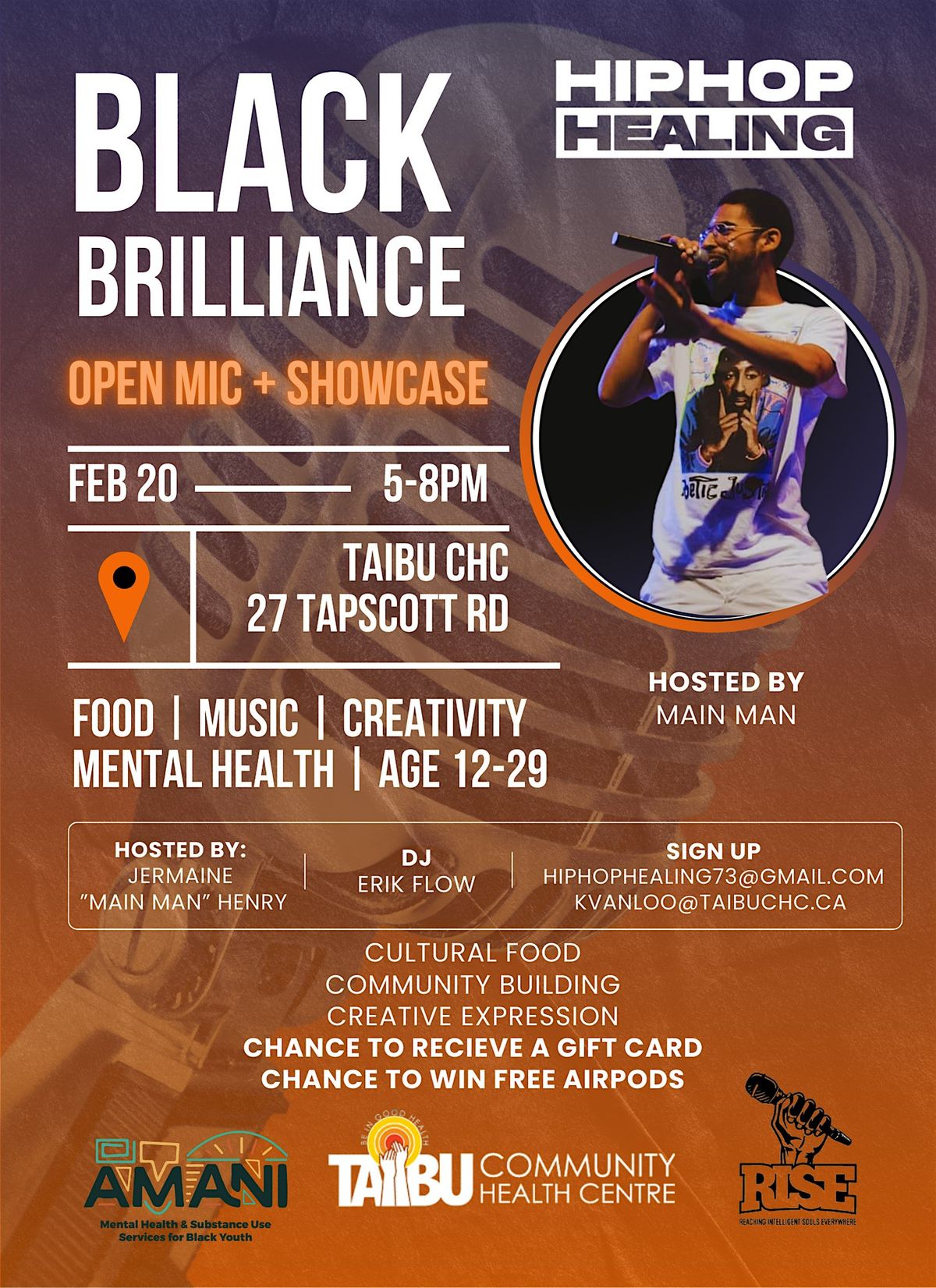 Hosted by Hip Hop Healing in partnership with TAIBU Community Health Centre, AMANI Mental Health & Substance Use, and RISE Edutainment, this event creates a welcoming space for spoken word, music, storytelling, and artistic expression across generations.