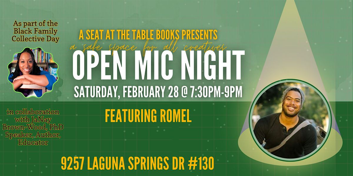Let's dim the lights and turn up the volume for Open Mic Night! Join us as a performer or attendee and cheer on your fellow artists. Play an instrument, sing a song, perform a dance, share your poetry or spoken word, or do a standup routine. You don't need to be an expert - A Seat at the Table Books is a community safe space and supportive environment for all. All experience levels welcome.