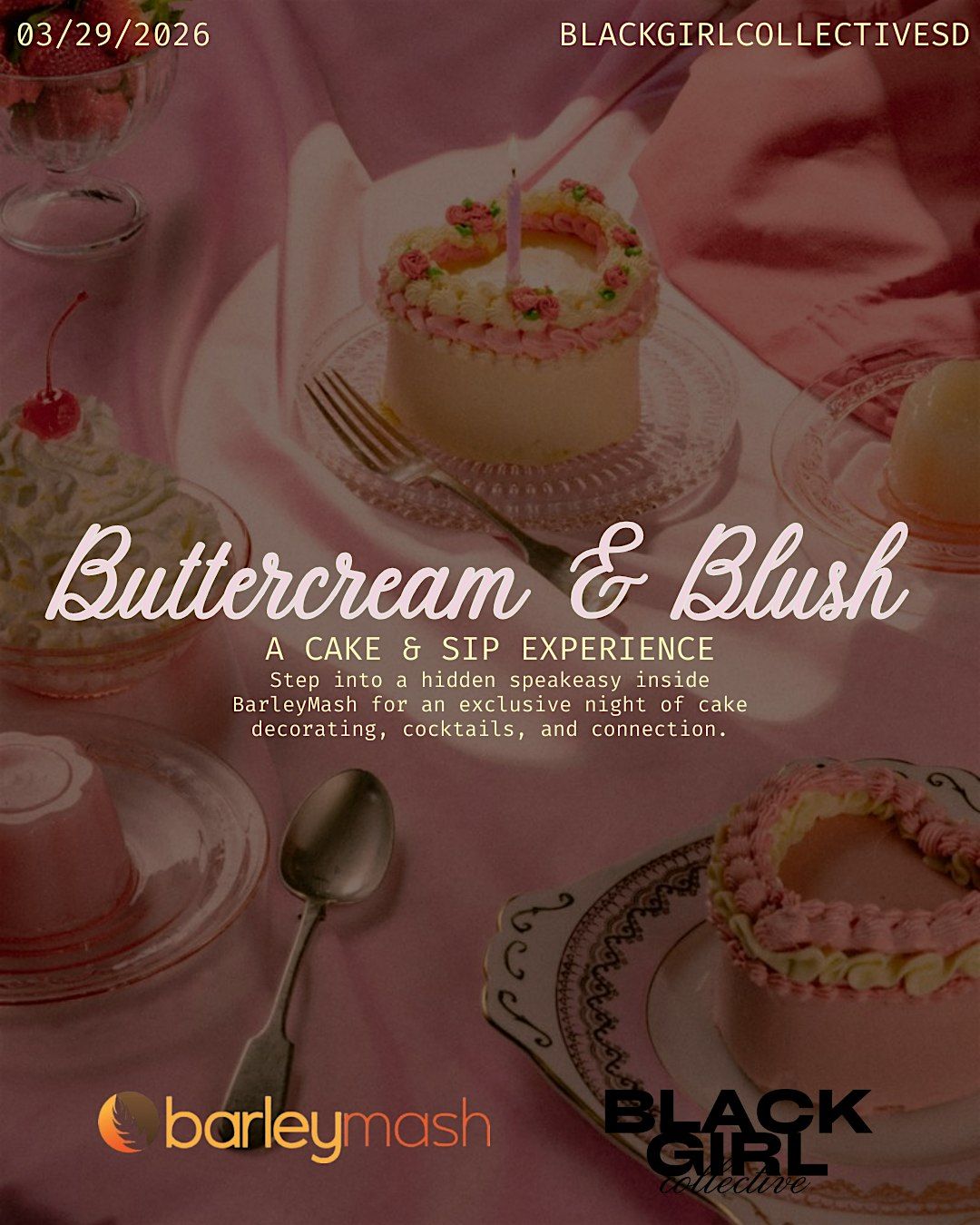 Join the Black Girl Collective for a fun and creative night of cake decorating, cocktails, and connection. Hosted at Ginger's Speakeasy inside Barleymash, guests will decorate their own pre-frosted 4-inch bento cake with guidance from Julissa of Enchanted Treats 619.