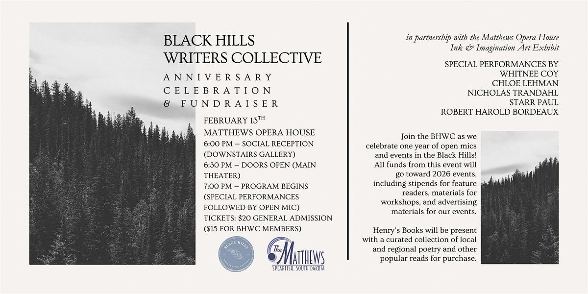 The Black Hills Writers Collective celebrates one year of building literary community in the Black Hills with a special evening at The Matthews. Five featured poets — Whitnee Coy, Chloe Lehman, Nicholas Trandahl, Starr Paul, and Robert Harold Bordeaux — will read original work accompanied by live music from Josh Lehman and guest musicians.