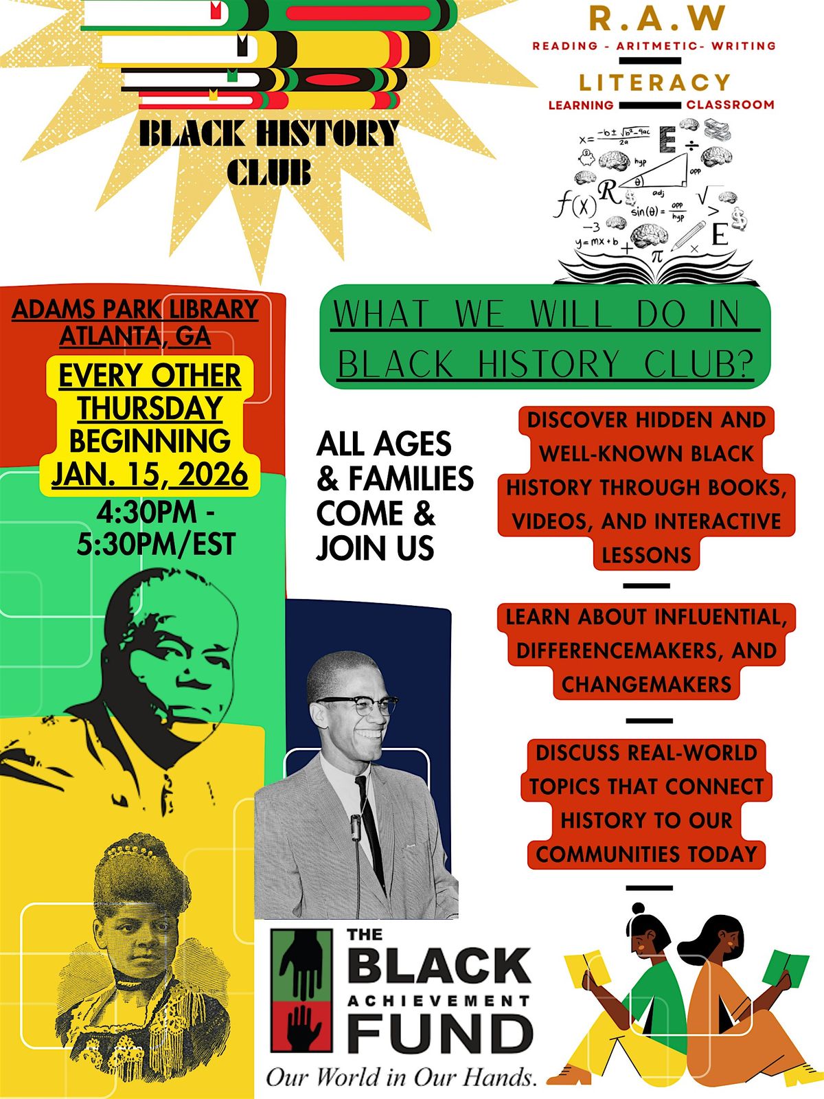 The Black Achievement Fund invites you to a joyful, educational, and community‑building experience at Adams Park Library — The BAF Black History Club. This welcoming is for all‑ages, designed to bring families, youth, elders, and neighbors together to learn, share, and celebrate the brilliance of African and African American history.
