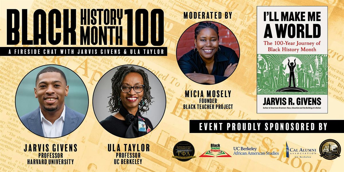 Alpha Phi Alpha Fraternity, Incorporated, Alpha Epsilon and Gamma Phi Lambda chapters, in partnership with the Cal Alumni Association, Black Teacher Project, and UC Berkeley Department of African American and African Diaspora Studies, are thrilled to invite you to our Black History Month 100 social and fireside chat with Professors Jarvis Givens and Ula Taylor, which will be moderated by Dr. Micia Mosely. Join us for an intimate conversation that will open space to reflect on the 100-year journey of Black History Month, and discuss how we can continue the tradition of teaching and preserving Black history to shape a better future. We invite you to hear their stories, share your experiences, and connect with community members as we celebrate this milestone. We are striving to create a space where all attendees depart feeling inspired and recharged to continue fighting for a world that is more free and more beautiful.