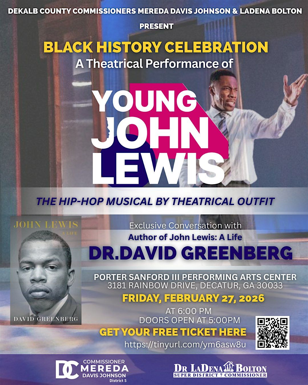 Join DeKalb County Commissioners Mereda Davis Johnson and LaDena Bolton for a powerful Black History Month Celebration featuring “Young John Lewis,” a dynamic theatrical performance that brings the life and legacy of civil rights icon John Lewis to the stage through storytelling, music, and movement.