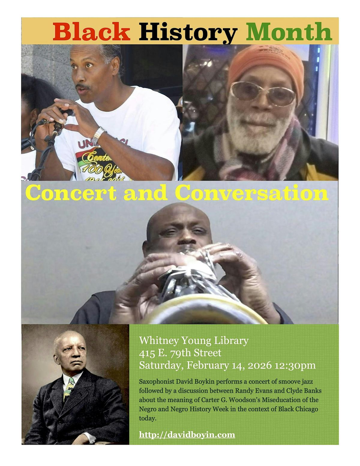 Saxophonist and composer David Boykin Performs a concert of original compositions and then leads a discussion with Randy Evans and Clyde Banks about the meaning of Carter G. Woodson’s Miseducation of the Negro and Negro History Week in the context of Black Chicago today.