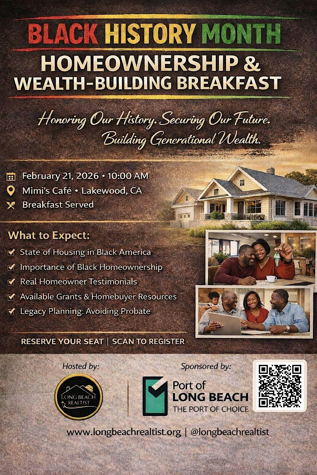 Hosted by the Long Beach Realtist Association and sponsored by the Port of Long Beach, this Black History Month Homeownership & Wealth-Building Breakfast is designed for individuals and families who are serious about building wealth through homeownership and creating a lasting legacy.