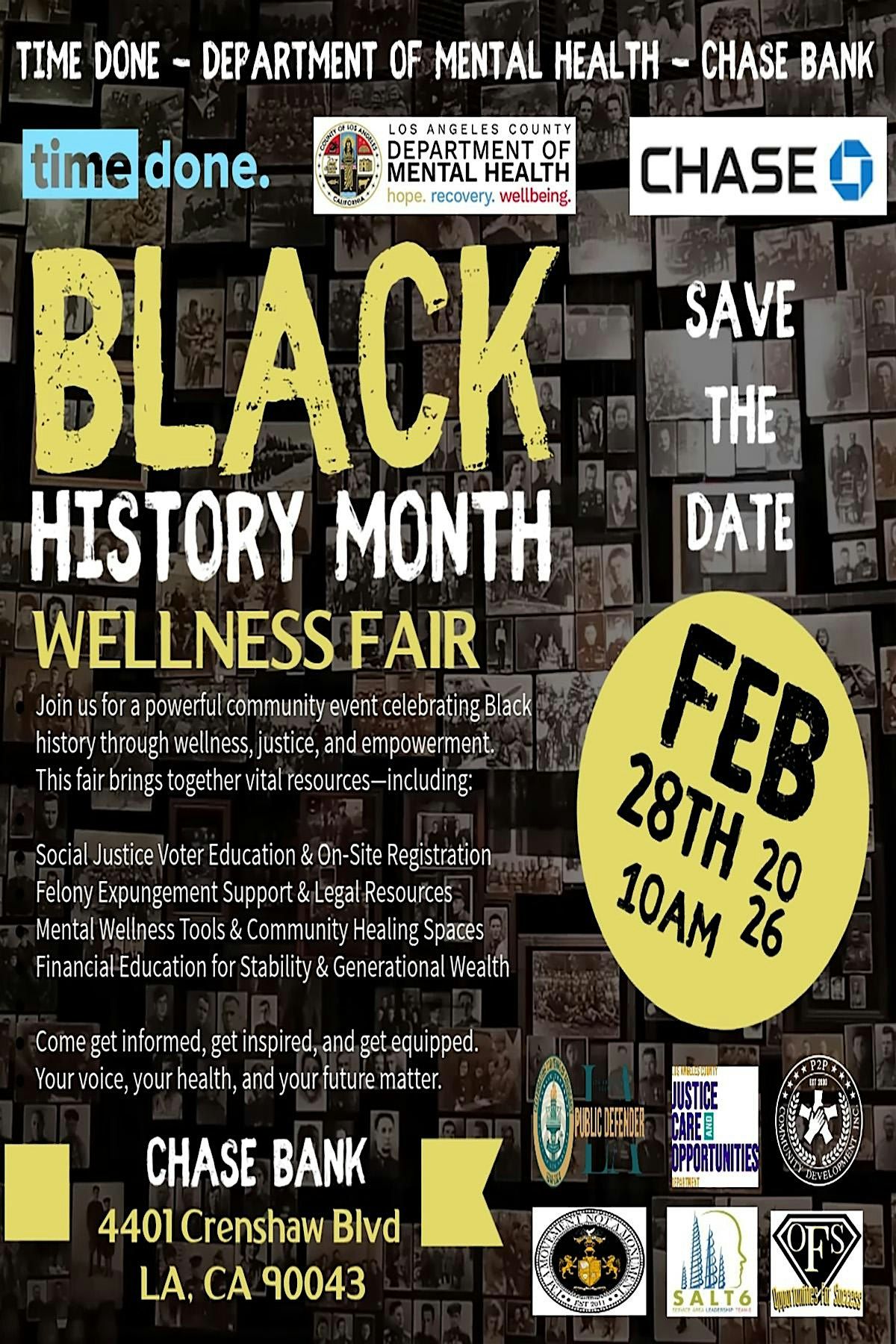 The upcoming Black History Wellness Fair is more than an event, it’s a movement for empowerment, equity, and holistic well-being in collaboration with Department of Mental Health , P2P Community Development INC, Time Done, Chase Bank. This community-centered fair will provide vital resources and education in four key areas: