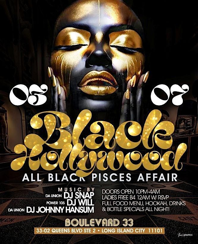 Black Hollywood All Black Pisces Affair \u2022 Ladies Free On Rsvp Saturday march 7th Black Hollywood all black pisces affair at Boulevard 33. 33-02 queens blvd LIC from 10PM-4AM. Ladies free 12 with rsvp!