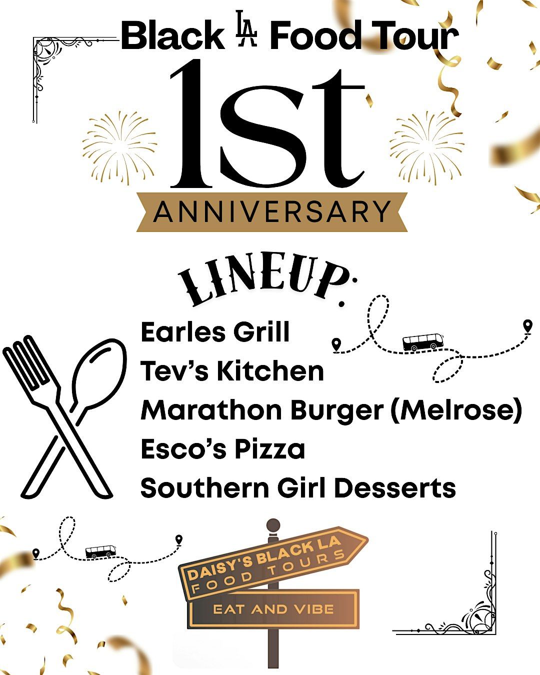 Guests will enjoy a curated lineup of local favorites including Earles Grill, Tev’s Kitchen, Marathon Burger on Melrose, Esco’s Pizza, and Southern Girl Desserts. Each stop offers a taste of the flavors, stories, and love that make LA’s Black food scene so special.