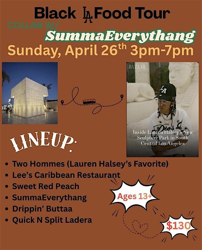 Black LA Food Tours x SummaEverythang presents a one of one experience at the Sculpture Park. Meet artist Lauren Halsey while tasting your way through LA’s Black culinary scene. This curated tour features stops at Two Hommes (Lauren Halsey’s favorite), Lee’s Caribbean Restaurant, Sweet Red Peach, SummaEverythang, Drippin’ Buttaa, and Quick N Split Ladera.