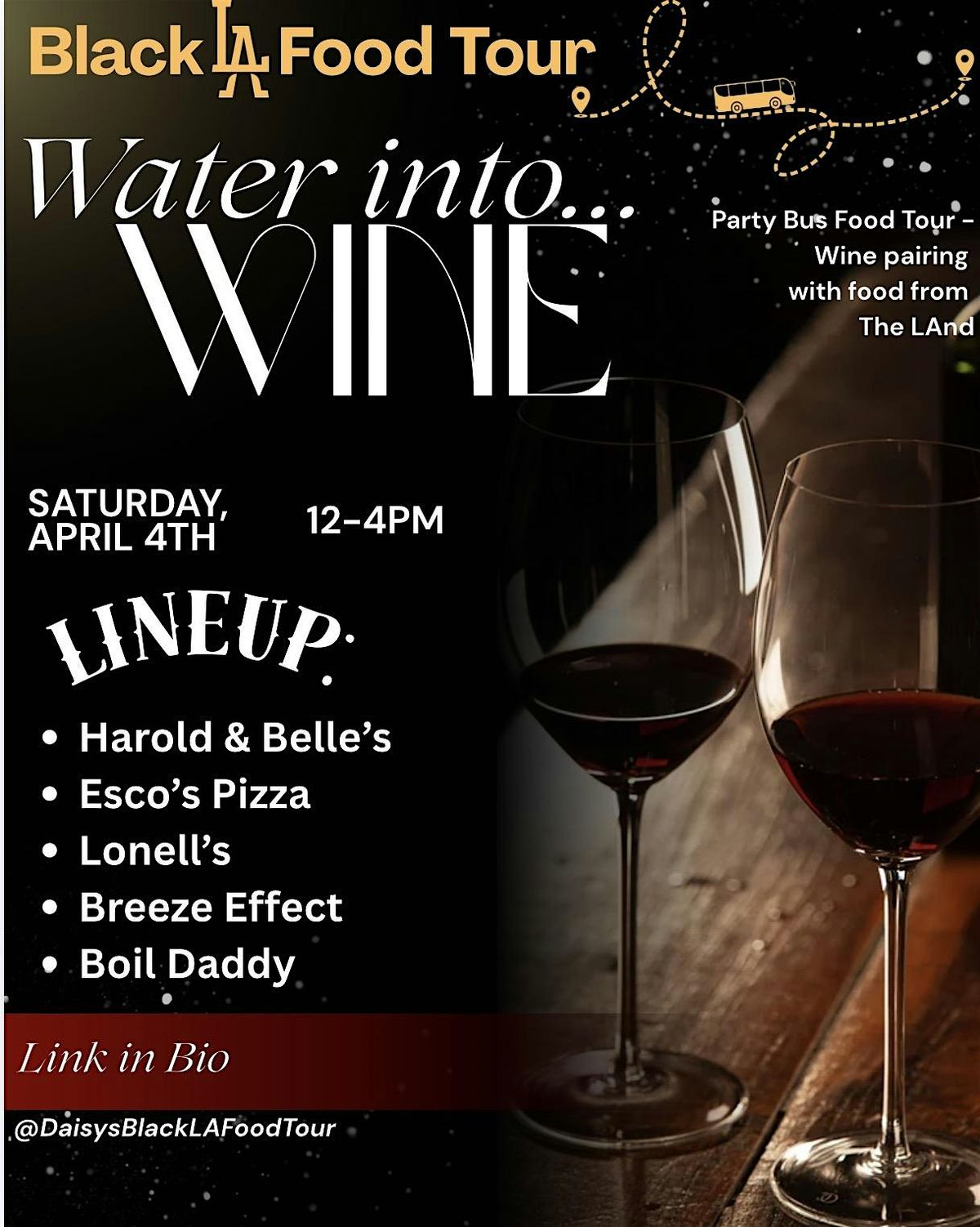 Water into Wine 🍷✨ is a curated party bus experience celebrating Black-owned restaurants across Los Angeles. Guests will enjoy samples of food, wine, and dessert while discovering local gems and hearing the stories behind each stop.