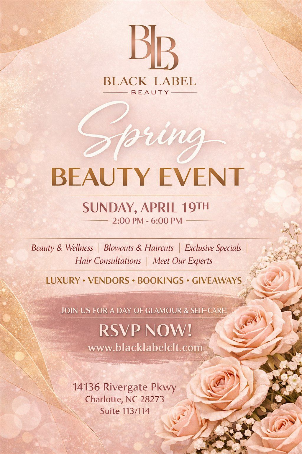 The Black Label Spring Beauty Experience is a luxury beauty event designed to bring beauty, wellness, and elevated self care together in one polished atomsphere. Guest will enjoy a warm, stylish experience featuring beauty services, hair consultations, blowouts, haircuts, wellness offerings, lash demos,featured vendors,giveaways and booking specials plus so much more. Curated moments designed to make every guest feel welcomed, seen and indulged.