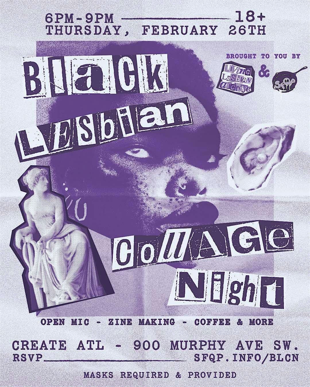 You’re invited to the Black Lesbian Collage Night, happening at 6PM on Thursday, February 26th at Create ATL (900 Murphy Ave SW Atlanta, GA 30310). Join as the Living Lesbian Archive runs and hosts a night of collage work, zine making, and an open mic. Plus coffee & refreshments from Sassy’s Coffee.