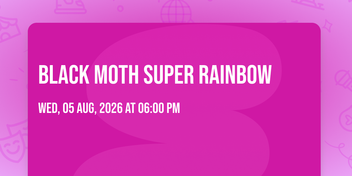 ✨ Discover the extraordinary at Black Moth Super Rainbow, where magic meets reality in ways you've never imagined! 🏛️ Set in AM/FM - Backyard nestled in bustling Dallas, TX, this event promises to be a landmark occasion. 📅 Taking place on August 5th, 2026 at 06:00 PM, it's going to create an atmosphere where every moment becomes a cherished memory. 🌟 Immerse yourself in an experience crafted with attention to every detail, designed to surprise and delight at every turn. They have worked tirelessly to ensure this event exceeds all expectations, bringing together elements of entertainment, innovation, and pure joy. 🎊 Don't miss your chance to be part of this remarkable journey!http://maps.seatics.com/FerrisWheelersBackyardAndBBQ_TblGA1GA2_2025-08-01_2025-08-01_1930_08012025_133541_SVGC_tn.png