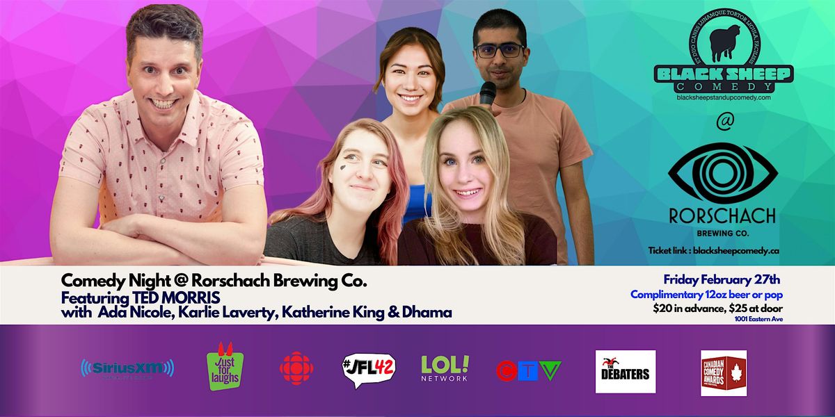 Headliner TED MORRIS (Just For Laughs, The Comedy Network, America's Got Talent) along with Karlie Laverty, Ada Nicole Smith, Dhama and Katharine King are sure to bring the laughs while Rorschach Brewing Co. brings the drafts.