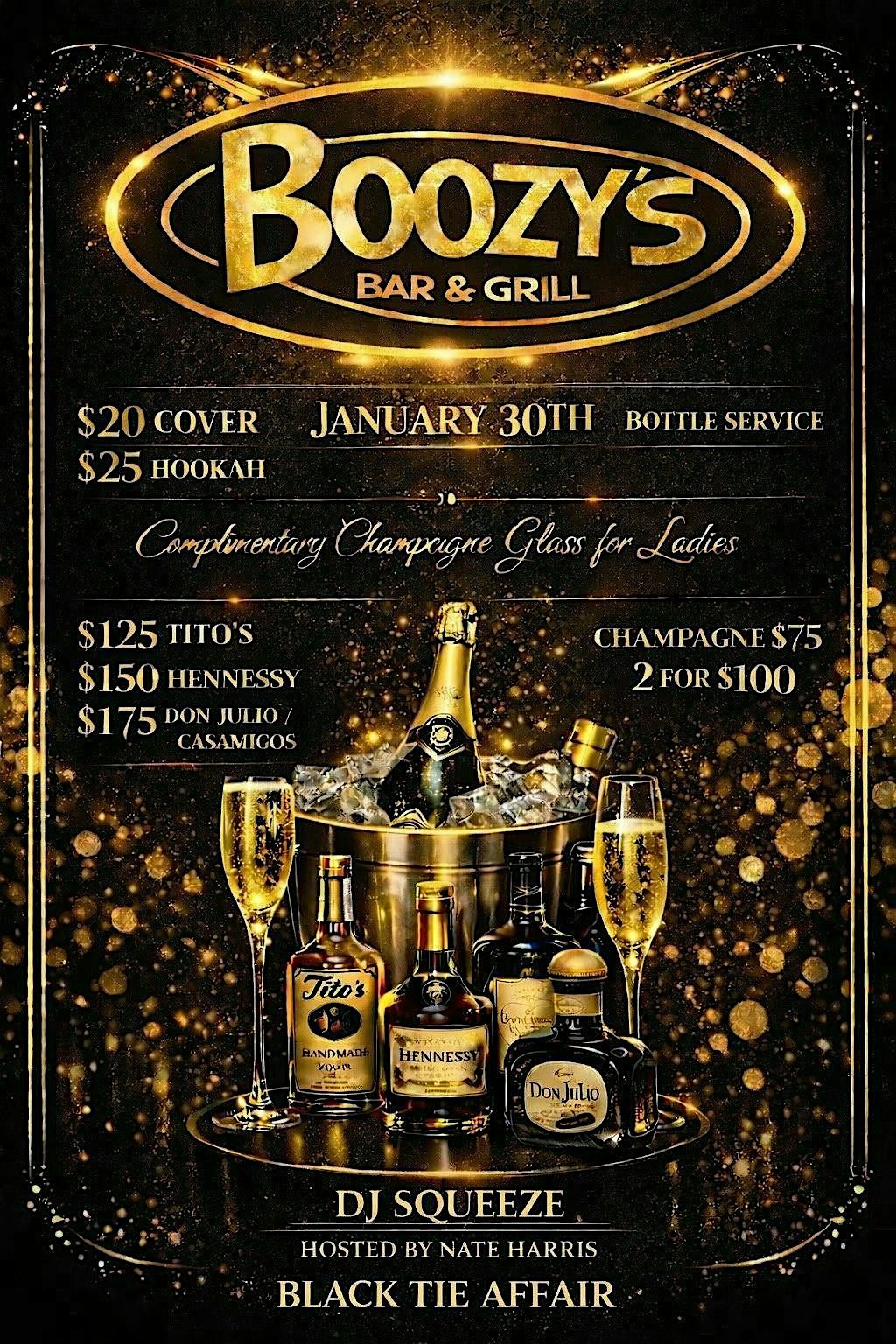 Upscale Black Tie Affair at Boozy’s Bar & Grill on Jan 30 with DJ Squeeze, bottle service, hookah, champagne specials, and luxe vibes.About this Event
