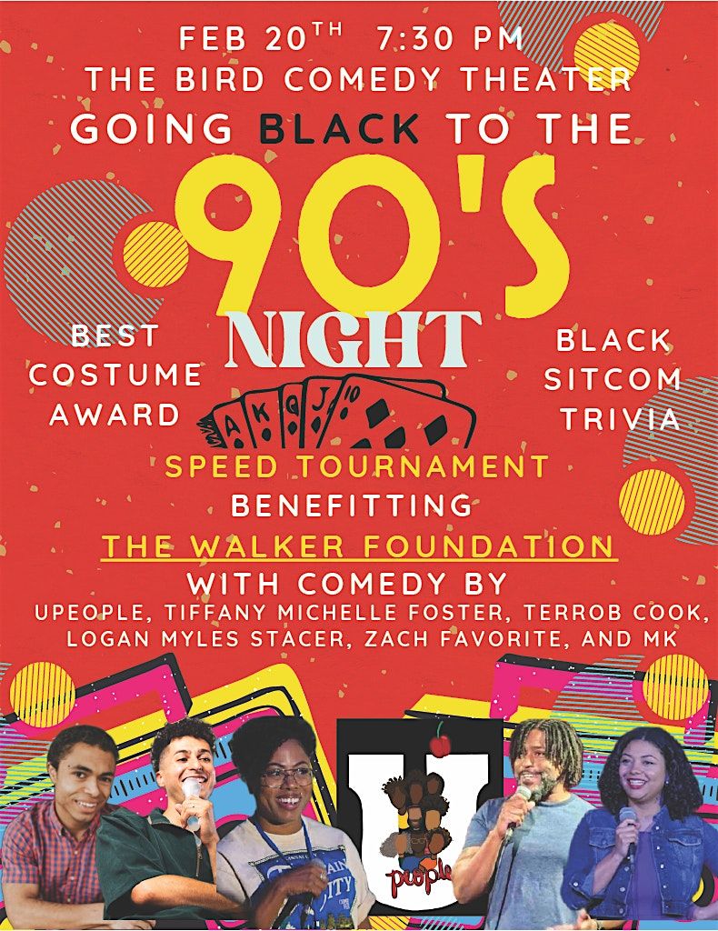Come celebrate Black Culture in the 90's with comedy by UPeople, Tiffany Michelle Foster, Zach Favorite, Terrob Cook, MK, and Logan Myles Stacer. 90's dress code with award for best dressed, black sitcom trivia, Kool Aid and a $10 buy in at the door for a Speed tournament benefitting the Walker Foundation.