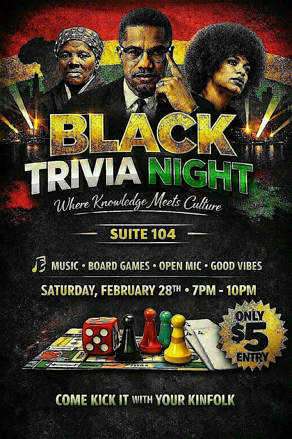 Get ready for an unforgettable night of culture, community, and fun at Black Trivia Night — where knowledge truly meets culture! Hosted at Suite 104, this high-energy experience brings people together for an evening packed with trivia, music, games, and live expression.