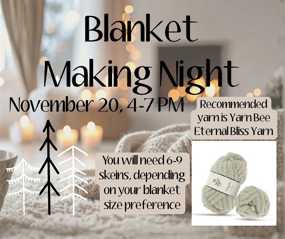 Come make blankets! Recommended yarn is Yarn Bee Eternal Bliss Yarn. You will need 6-9 skeins, depending on your blanket size preference