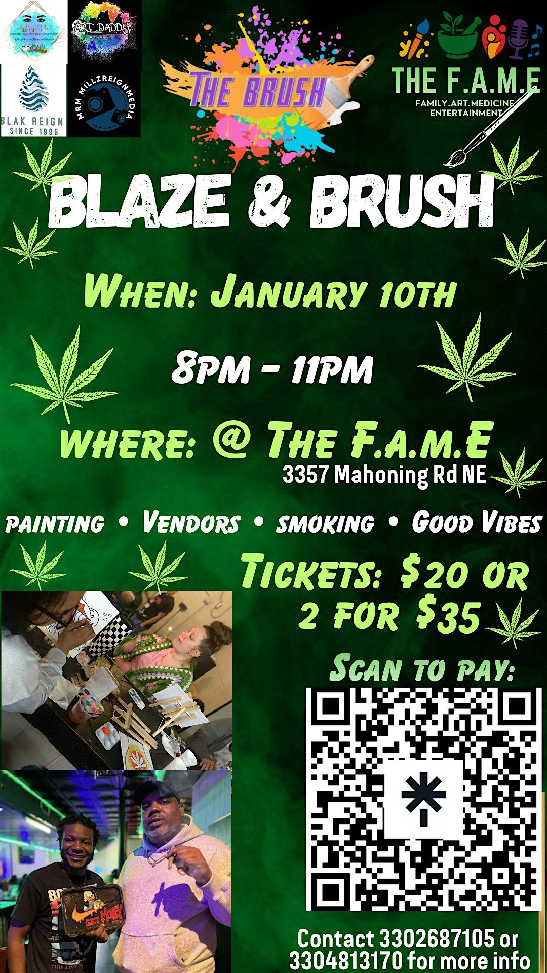 Welcome to Blaze & Brush (Puff & Paint)! Join us at 3357 Mahoning Rd NE on January 10, 2026 at 8:00 PM (Eastern Time) for a night of creativity and relaxation. Grab your friends and unleash your inner artist while enjoying some herbal inspiration. No experience necessary, just bring your positive vibes! Let's paint the night away together. See you there!