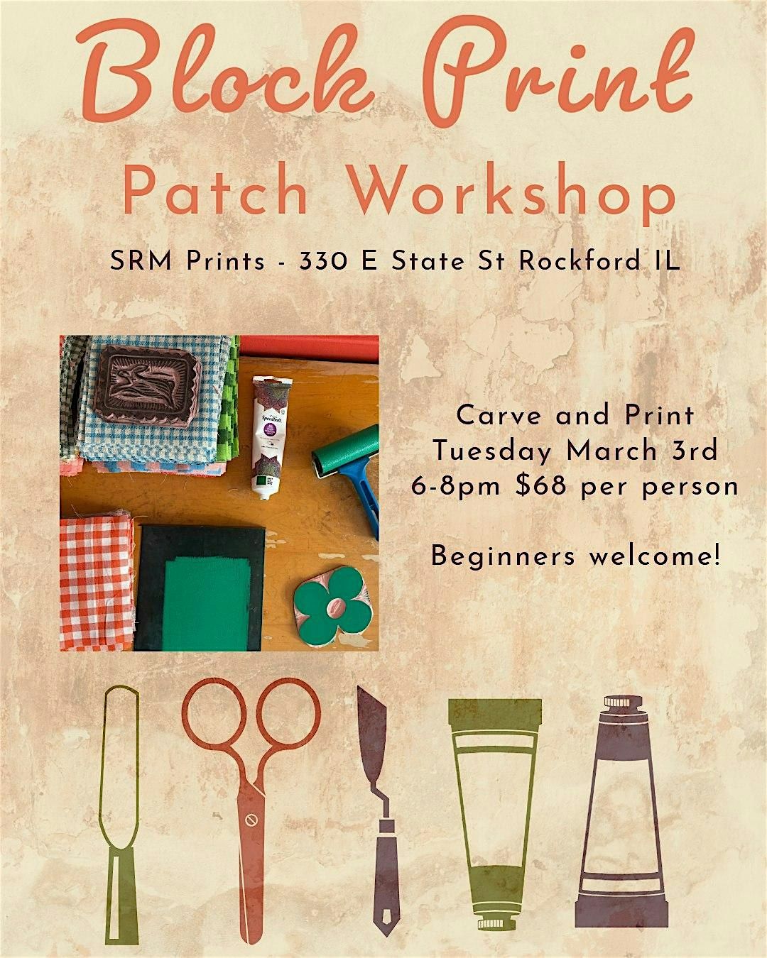 In this hands-on textile workshop, you’ll design and carve your own textile printing block, then spend the evening building a small printed edition of 6” fabric patches — each one pulled by hand, each one carrying your mark.