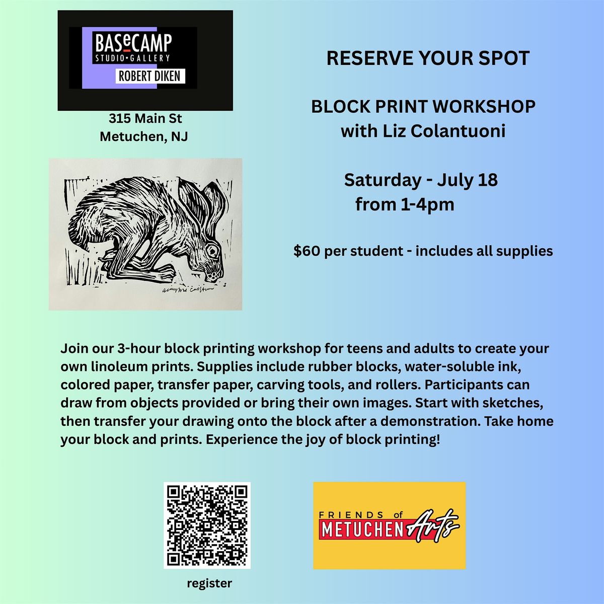 Join us at Basecamp Studio & Gallery on July 18, 2026 at 1:00 PM (Eastern Time) for a fun and hands-on block printing workshop with Liz Colantuoni! Whether you're a beginner or just looking to try something new, Liz will guide you through the creative process in a relaxed and friendly setting. Bring your creativity and get ready to make some awesome prints!