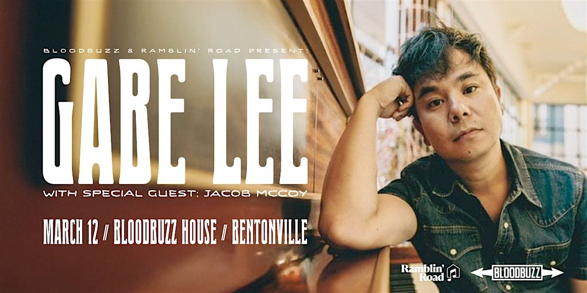 Our first show of the year is Gabe Lee with special guest Jacob McCoy on March 12th at the Bloodbuzz House in Bentonville. We are excited to bring Gabe back to the area for another great show and thrilled to be working with Ramblin' Road to present this show to you.
