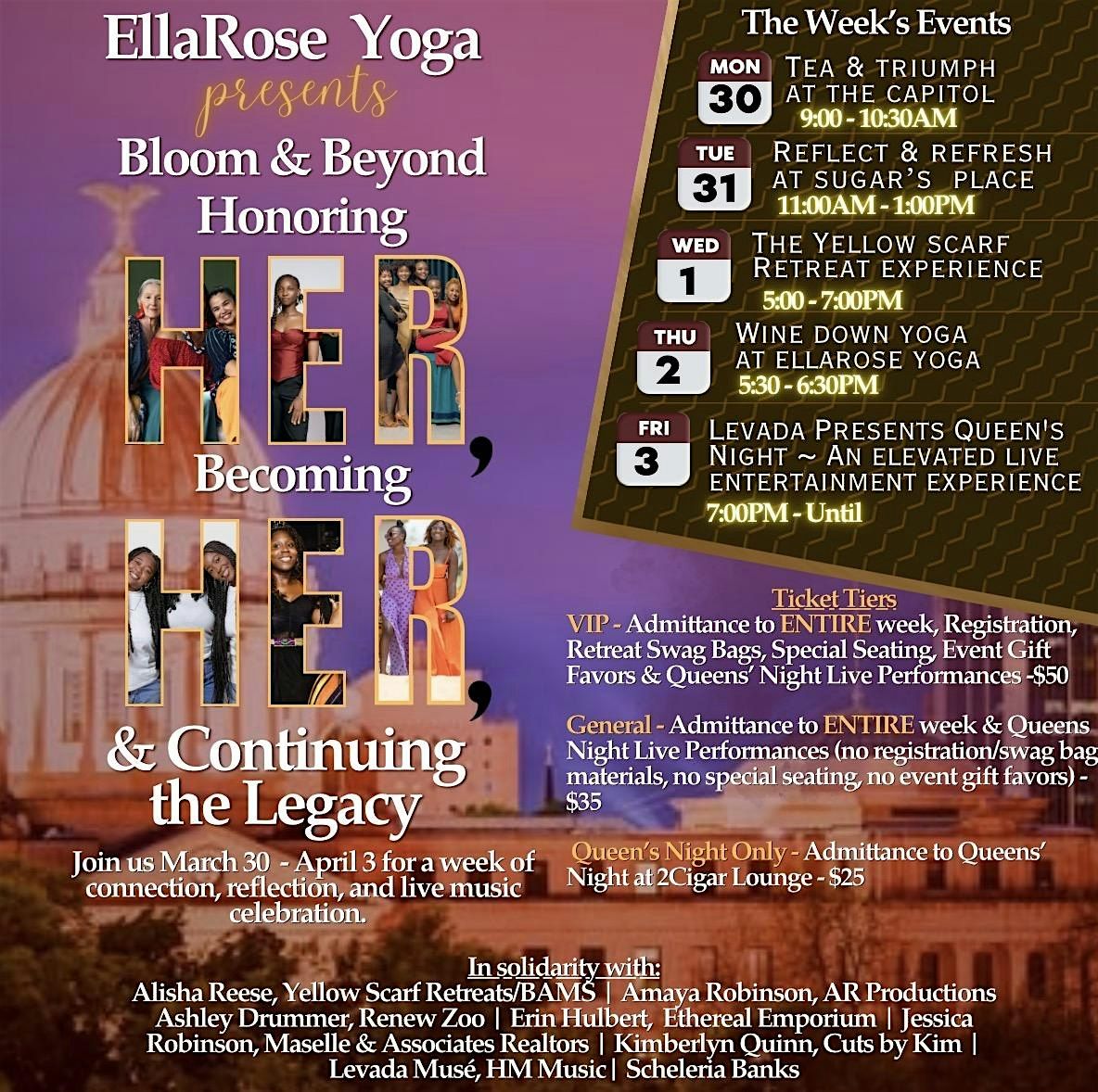 Join us for a week long vibrant celebration where we honor the power and journey of HER. This event is all about growth, inspiration, nature, healing, presence, excitement/entertainment, and carrying forward a beautiful legacy. Come ready to connect, learn, and be part of something truly special. Let’s bloom together and continue to spread love and joy all over everything we touch!!