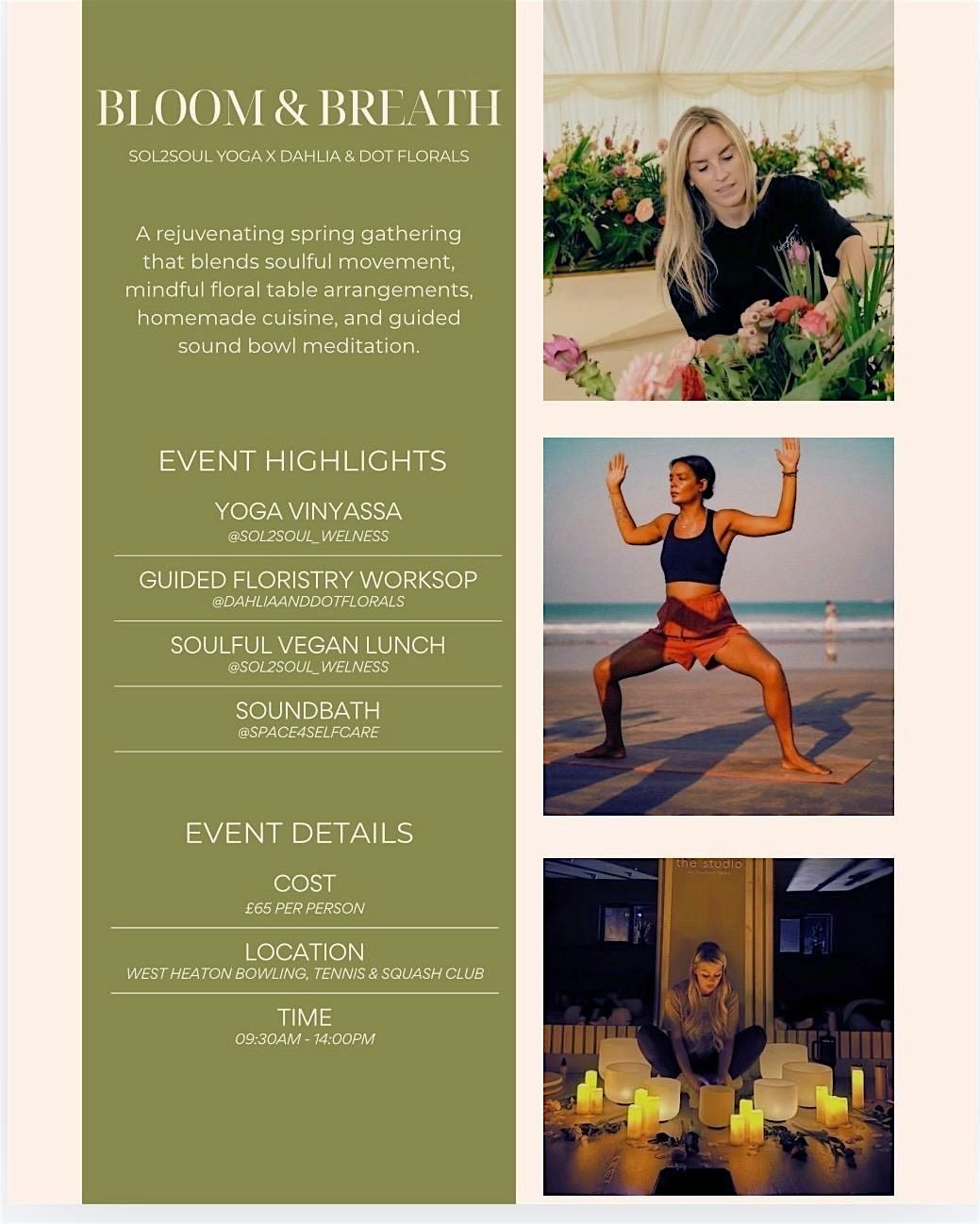 Set in a calm and inspiring space, guests will begin the experience with a grounding yoga session with Sol2SoulYoga. Midway through the retreat, you’ll pause to enjoy a nourishing, seasonal lunch thoughtfully prepared to refuel your body and gently break up the morning and afternoon sessions. This shared moment offers time to relax, connect with others and continue the calm, unhurried rhythm of the day.