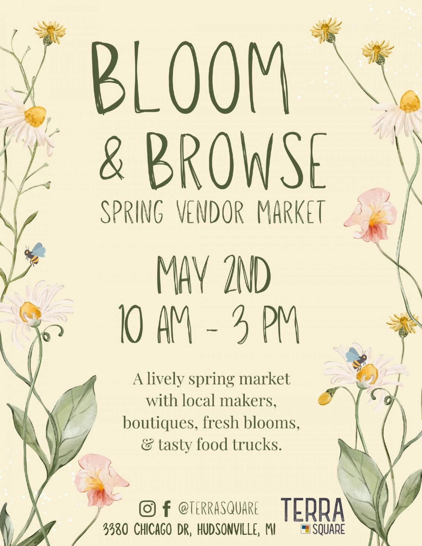 A lively spring market with local makers, boutiques, fresh blooms, and tasty food trucks. FREE entry!