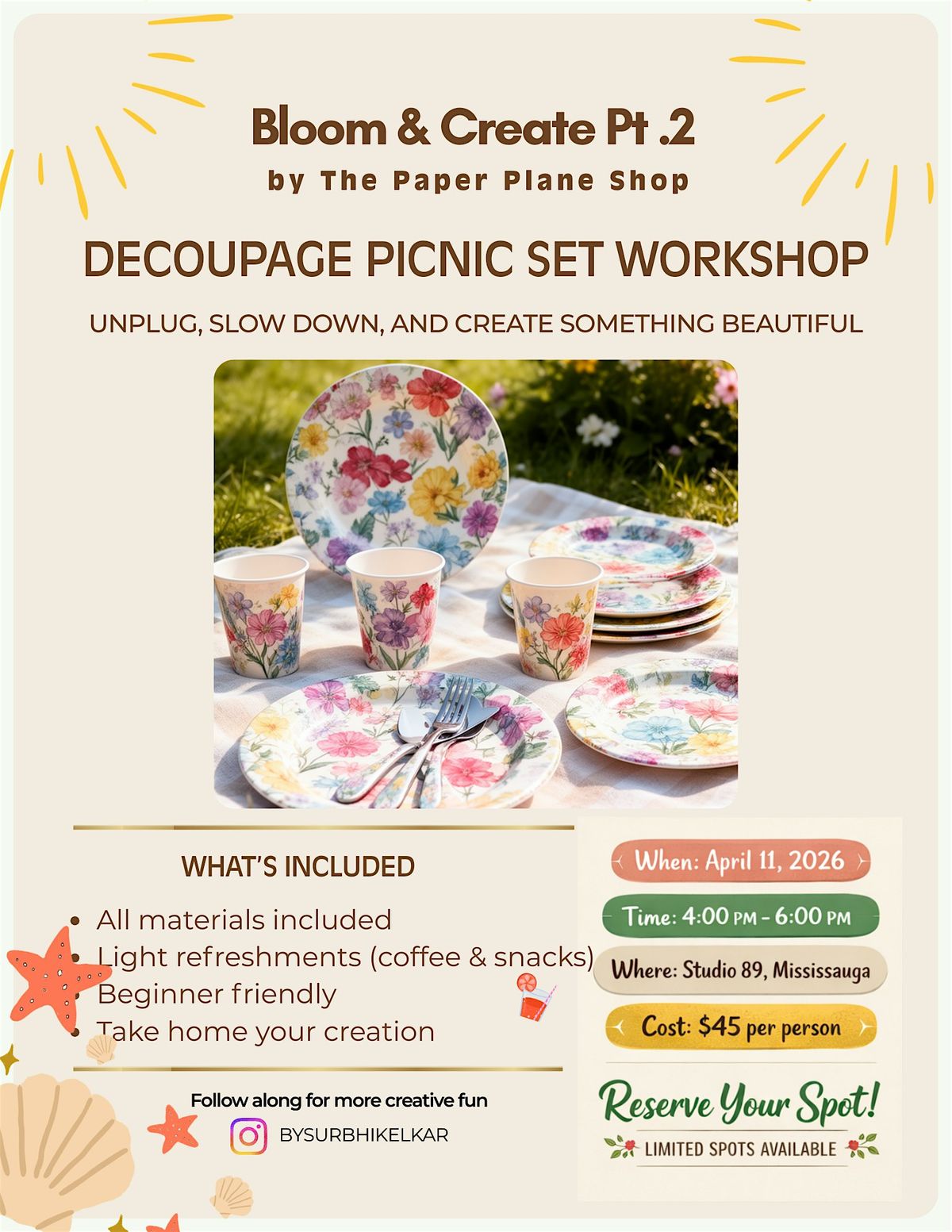 Join Mississauga crafters for a fun DIY decoupage picnic set workshop! Apr 11, beginner-friendly & creative. Reserve your spot!