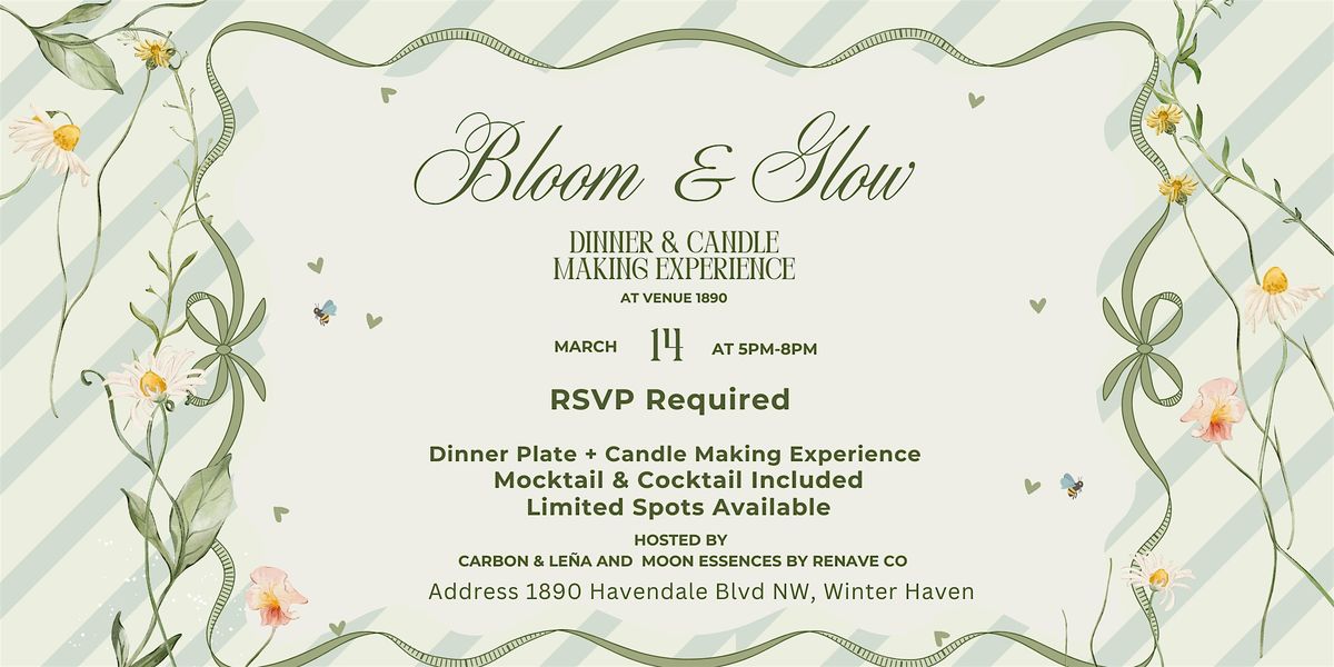 Join us for an unforgettable evening of creativity and connection at Bloom & Glow—a luxury mingle-style experience featuring a Candle Making Bar, Mocktail Bar, and a delicious Spanish dinner plate by Carbon & Leña