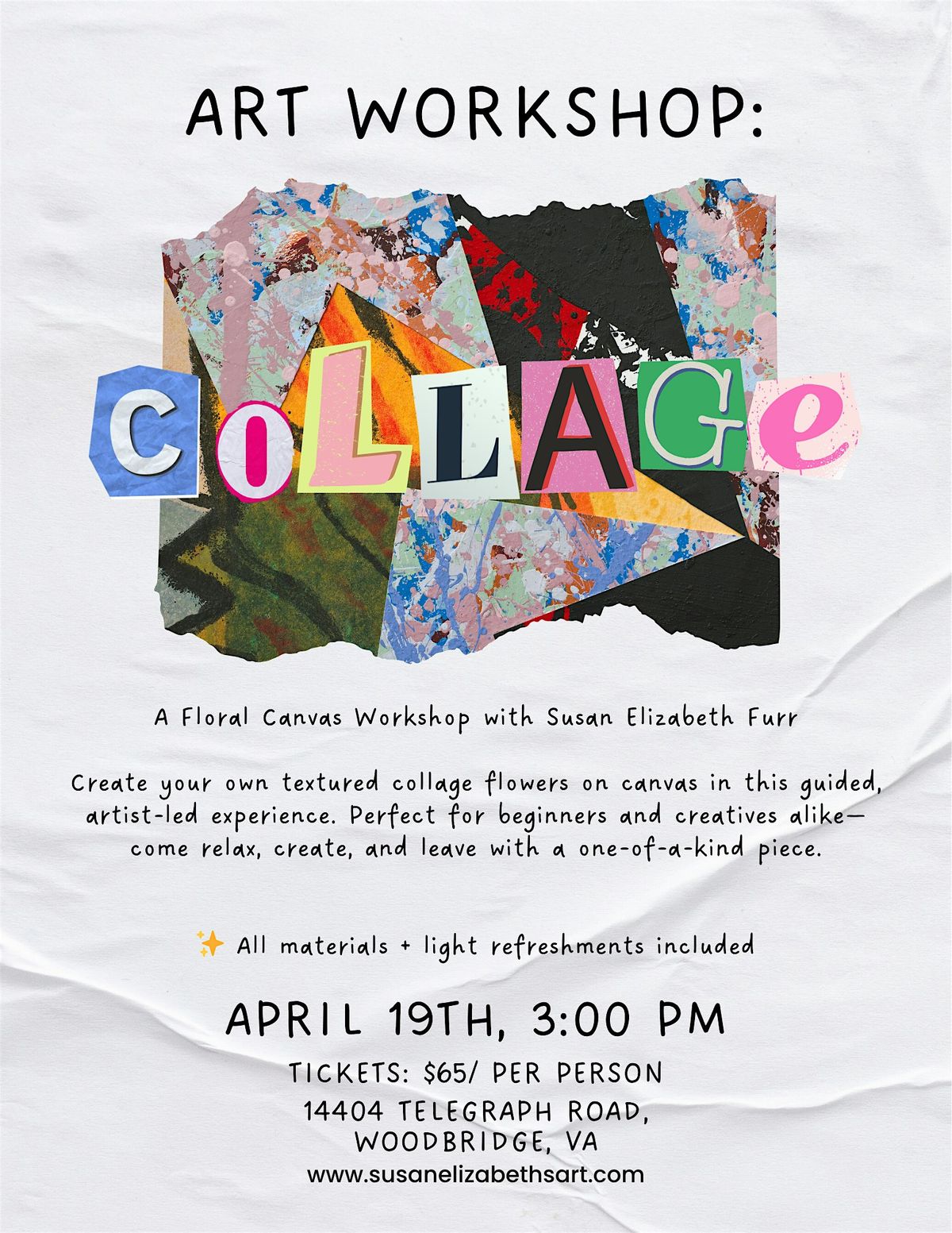 Join us to create mixed‑media floral collage art on canvas—supplies provided.