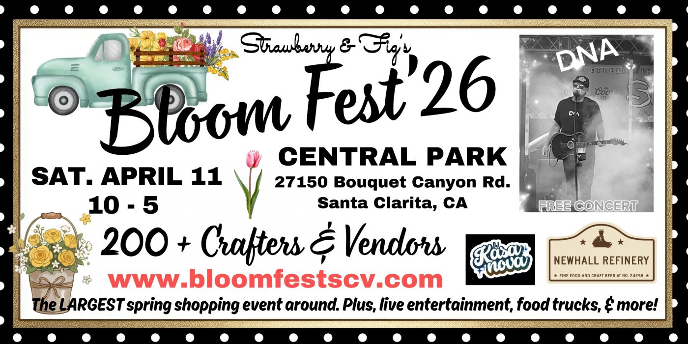 Strawberry & Fig's annual BLOOM FEST will be taking place on Saturday, April 11th at Central Park in Santa Clarita, CA. This highly anticipated FREE event is not only the largest spring shopping event around, with 200 artisans, crafters and vendors, but there's much more to enjoy. Starting off the day is DJ Kasanova from 10-1, followed by our headliner band "DNA", from 1:30-5PM.This premier cover band will have you dancing and having a good time with their country and classic hits. Grab a drink from Newhall Refinery, which will be offering beer, wine & mixed drinks, and enjoy the show! In addition, there will be some of the best food trucks around, permanent jewelry, caricatures and much more!