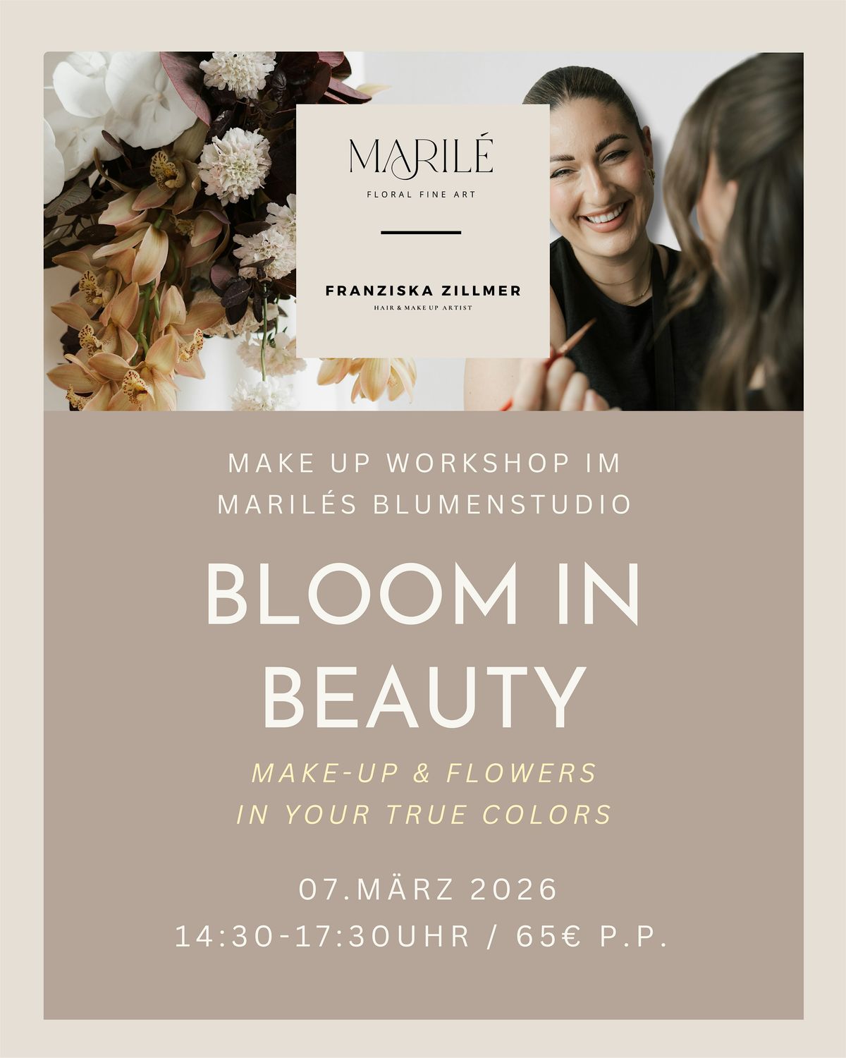 BLOOM IN BEAUTY verbindet Make-up, Typberatung und Floristik zu einem einzigartigen Workshop-Erlebnis. Entdecke deinen Farbtyp, lerne ein Make-up, das dich wirklich zum Strahlen bringt, und gestalte dein eigenes Mini-Blumenarrangement in deiner persönlichen Farbpalette. Ein Nachmittag voller Inspiration, Schönheit und Blütenmagie.