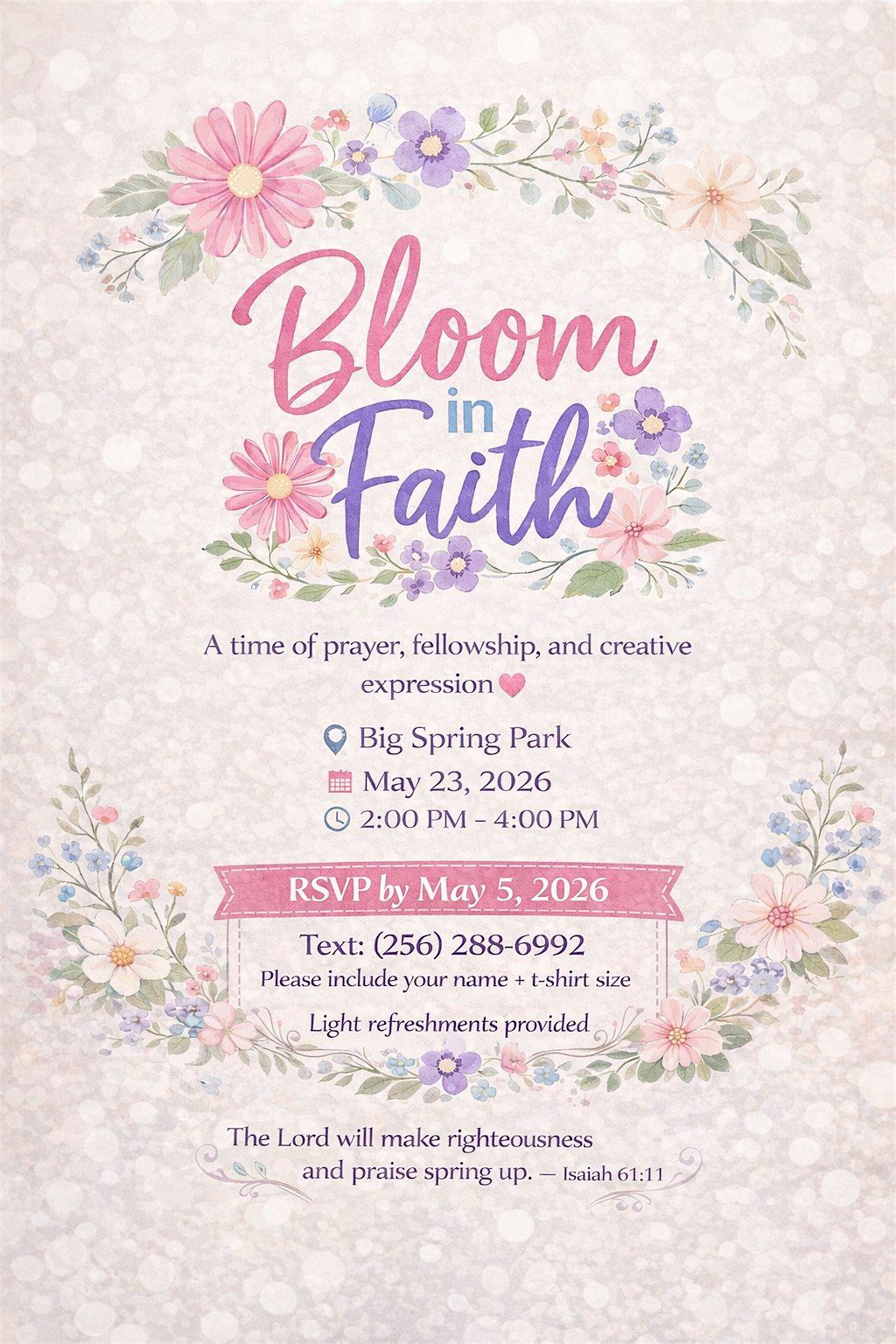Get ready to grow your spirit and connect with amazing people in person. Bloom in Faith is all about coming together, sharing stories, and finding inspiration in a relaxed, friendly vibe. Whether you're curious or deeply rooted, this event is your chance to nourish your faith and have a great time. Donโt miss out on this uplifting experience โ canโt wait to see you there!
