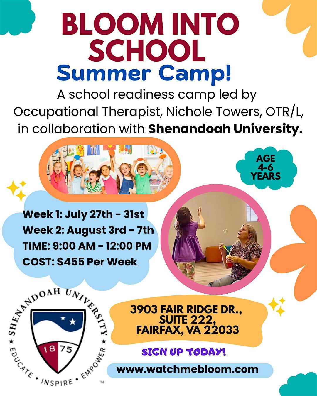 Bloom into School is a one-week program (3 hours per day) designed to help children build the social, emotional, and practical skills they need for a confident start to school. The program is led by our experienced Occupational Therapist, Nichole Towers, OTR/L, in collaboration with Shenandoah University. Children will learn through hands-on activities, games, and group experiences to develop and strengthen developmental skills while learning to work with others. We will practice routines like attendance/circle time, lunchtime, specials and bathroom breaks. While the focus is on playful learning and fun, we will be secretly building your child’s confidence before they walk through the doors on their first day of school!