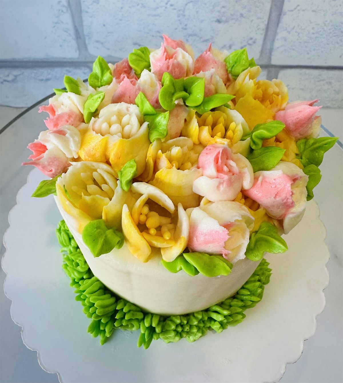 Each student will receive a crumb coated cake and will learn how to apply the final buttercream and learn how to pipe colorful florals using Russian Piping tips. You'll learn how to pipe leaves and grass too!