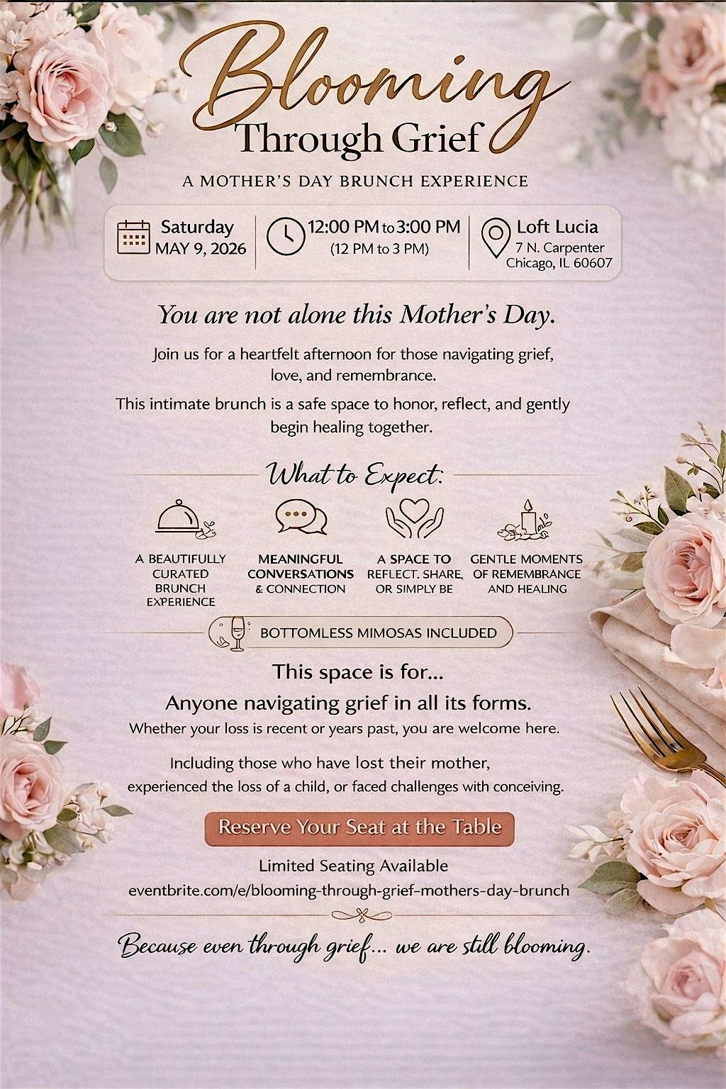 Blooming Through Grief is an elevated Mother's Day brunch experience designed to honor love, loss and the strength it takes to keep moving forward. Created for those navigating grief in all its forms, this intimate gathering offers a refined, compassionate space to pause, reflect and reconnect.