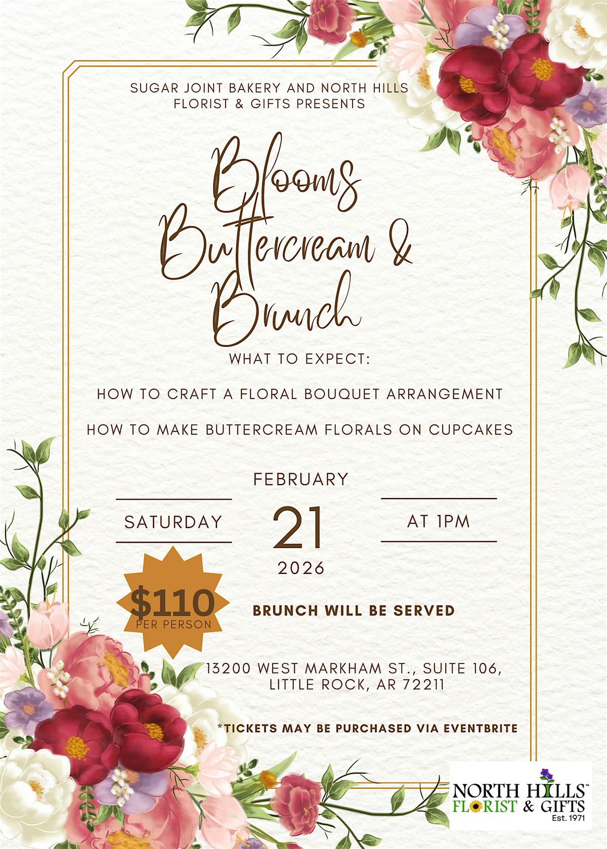 This exclusive collaborative class is hosted by Sugar Joint Bakery Studios and North Hills Floral & Gifts, bringing together sweet treats, florals, and unforgettable moments.