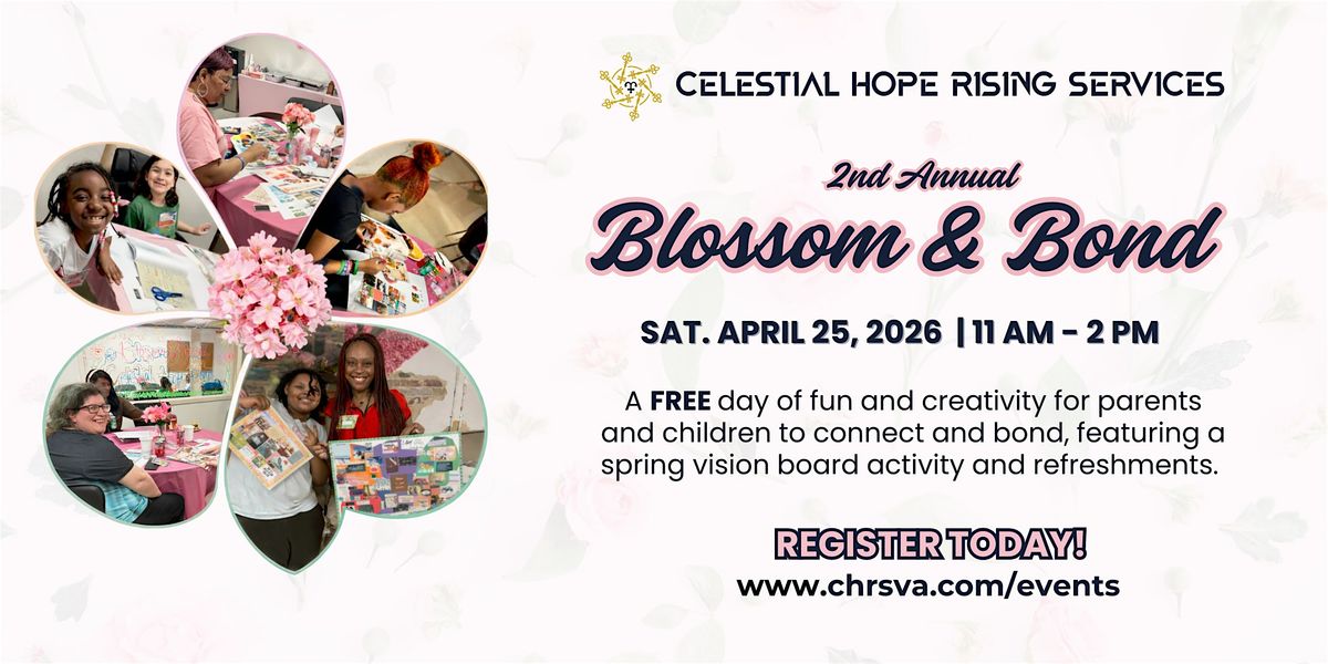 Join us for the 2nd Annual Blossom & Bond, a free parent and child experience centered on manifesting wellness, intentional growth, and meaningful connection. This uplifting spring gathering invites families to slow down, reflect, create, and bond while setting positive intentions for the season ahead.