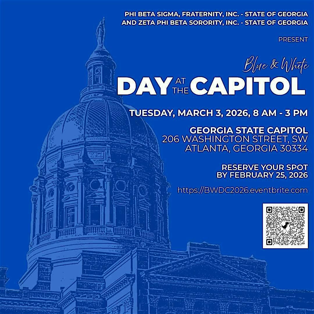 Join Phi Beta Sigma, Fraternity, Inc. and Zeta Phi Beta Sorority, Inc. for Blue and White Day at the Georgia State Capitol on Tuesday, March 3, 2026, 8 AM. The Georgia State Capitol is located at 206 Washington St. SW, Atlanta, GA. During the day at the Capitol, guests will have a chance to tour the capitol, hear about how legislation process, and meet Georgia Senators and Georgia House Representatives. Resedrve your spot by February 25, 2026.