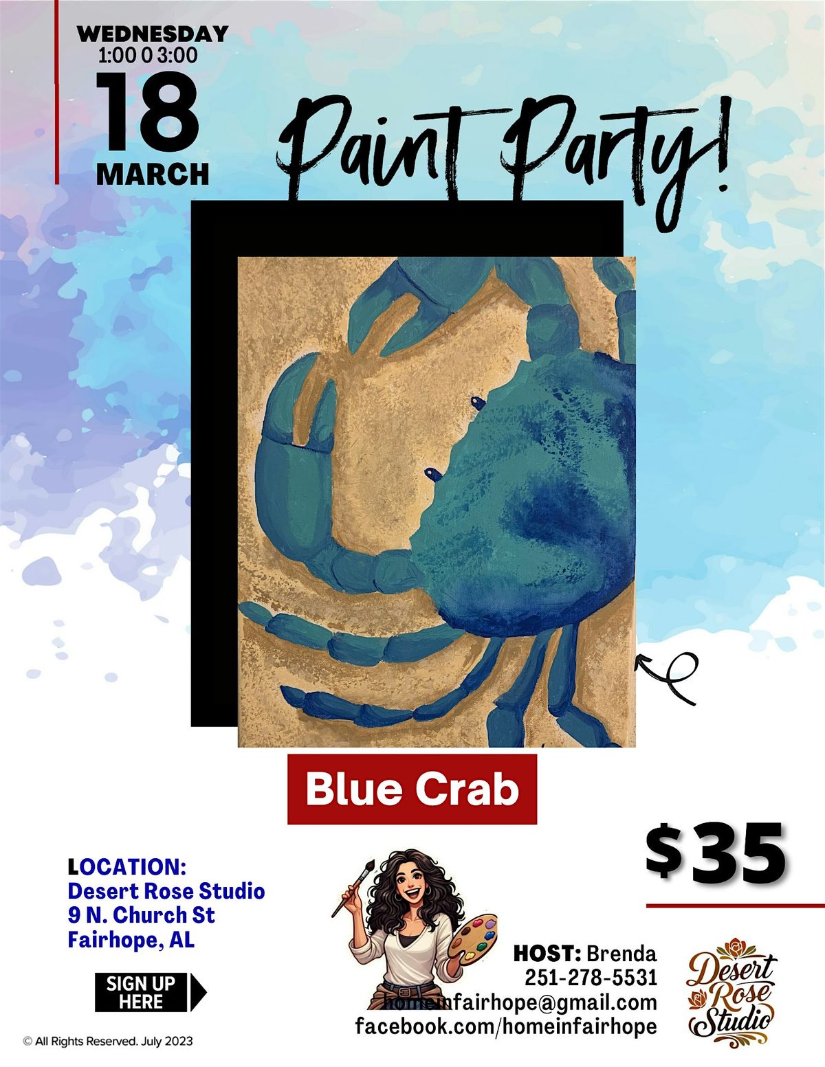 Join us for a fun in-person event where creativity meets coastal vibes! Whether you're a seasoned painter or just looking to try something new, the Blue Crab Paint Party is the perfect place to relax, paint, and make new friends. We'll provide all the supplies—you just bring your enthusiasm! Come ready to laugh, create, and maybe even discover your new favorite hobby.