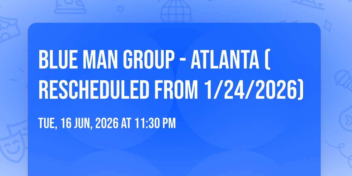 📍 Location: 33.7726, -84.3855🎉 Welcome to Blue Man Group - Atlanta (Rescheduled from 1/24/2026), where dreams come alive and possibilities are endless! 🏛️ Join us at Fox Theatre Atlanta in the heart of Atlanta, GA for an event that defies expectations. 📅 On June 16th, 2026 at 11:30 PM, be part of something truly extraordinary as we bring together innovation, entertainment, and pure magic. ✨ Every aspect has been carefully designed to ensure an unforgettable experience for all our guests. Whether you're seeking adventure, inspiration, or simply a break from the ordinary, this event promises to deliver beyond your wildest dreams. 🎊 Prepare for a journey into the extraordinary!