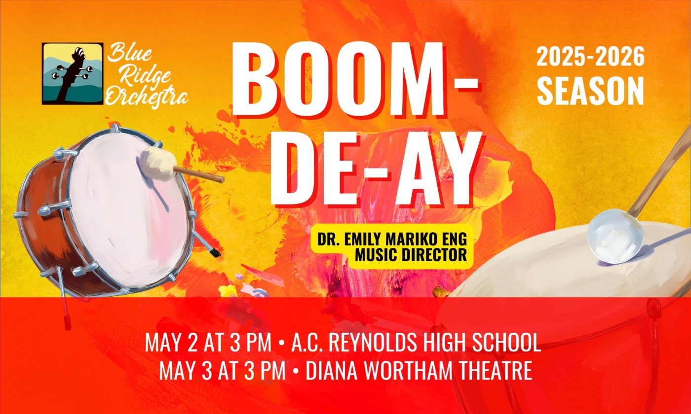 Ta-Ra-Ra, “BOOM-DE-AY”− The Blue Ridge Orchestra echoes its previous program (Ta-Ra-Ra), while celebrating the spirited 26th season finale under the leadership of Music Director Dr. Emily Mariko Eng. The BRO ‘Booms’ with percussive explosions in Natalie Williams’s Sonic Boom, Chaminade’s Callirhoë Suite, Stravinsky’s “Berceuse” and “Finale” from the 1919 version of the Suite from The Firebird, and Ravel’s orchestration of Mussorgsky’s “Pictures at an Exhibition.”