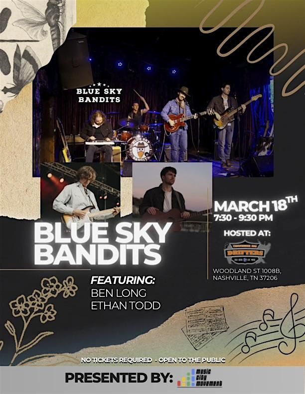 Get ready for a great night of live music with the Blue Sky Bandits bringing their energy and expertise in bringing down the house live at Drifters BBQ! Joining them are the exceptionally talented Ethan Todd & Ben Long. It's gonna be a fun evening filled with great tunes, good eats, cold beer, and the best company. Don’t miss out on this dopamine hit of a lineup for some unforgettable moments!