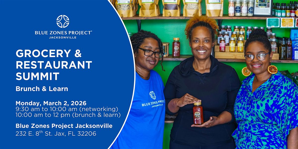 The Grocery & Restaurant Summit will serve as a resource-focused convening for restaurants and grocery stores in Jacksonville. The summit will provide a clear overview of Blue Zones, the approval process, and the benefits of participation, while connecting attendees to practical tools, incentives, and community partners that support approval readiness and long-term sustainability. Brunch will be provided.